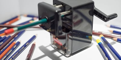 The extremely durable helical blade of the Super Point Mini means that all cores can be sharpened to a extremely fine point quickly and easily. An extendable front plate and self feeding mechanism ensures perfect sharpening every time. The hole can take barrel sizes from 7mm-9mm which covers all Derwent pencils. A sliding tray allows the reservoir to be emptied easily and the blade is removable for cleaning. On top of that, the sharpener comes with its own desk clamp to stop any movement when winding the handle, so your pencils are always ready for action when you are.