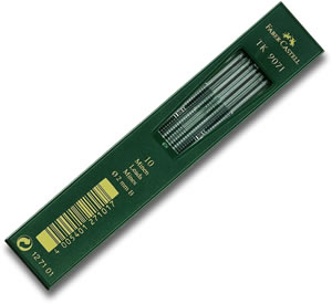 Faber Castell TK 9071 Clutch Pencil Leads give an intense black, blueprintable line with a smooth surface.  For blueprints use 6B - 5H, for microfilm 6B-3B and roughened transparency HB-6H.  Tubes of 10 leads