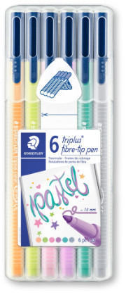 Staedtler Triplus Colour Pens - Desktop box of 6 Pastel ColoursStaedtler Triplus Colour pens has a triangular barrel and ergonomic design for effortless grip and writing.  The waterbased ink comes in 48 brilliant colours and drysafe technology meands the pen can be left uncapped for days without drying.  The sturdy, fibre tip is pressure resistant and gives a line width of approx. 1.0mm